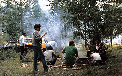 Am Wochenende kommt ein Kleinbus und fährt die gesamte Gastgeberfamilie samt Ziege in Richtung Norden. Auf einer Lichtung im Lärchenwald wird zunächst die Ziege geschlachtet und dann wird das Garen im eigenen Balg vorbereitet. Dazu werden die ausgelösten Fleischteile wieder in den Balg gesteckt und dieser wird mit Draht wieder verschlossen unter Zugabe von glühenden Steinen und dann wird von außen auch noch Hitze zugeführt. Da die Prozedur einige Stunden in Anspruch nimmt, durchstreifen wir die Wälder und sammeln Pilze, zunächst auf Verdacht, in der Hoffnung dass uns jemand die essbaren bestimmen kann. Leider weis aber keiner der Anwesenden welche essbar sind, denn selbst bei Pilzen, wo ich mir relativ sicher bin, heißt es immer giftig. Traditionell kennen Mongolen auch nur einen einzigen essbaren Pilz, den berühmten Zagaan Moog, das heißt einen weißen Wiesenchampignon. Die unzähligen Waldpilze, von denen die meisten mit Sicherheit essbar sind, werden von den Mongolen überhaupt nicht beachtet. Also gibt es Ziege ohne Pilze, dafür aber mit viel Wodka.