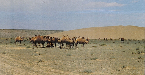 Bei dem Überfliegen der Landschaft in geringer Höhe entsteht der Eindruck einer relativ grünen Vegetation, zumindest für eine Wüste. Bei der Landung wird dann aber doch der Unterschied zur Steppe deutlich. Der Boden ist von Kieseln bedeckt und einzelne Lauchhalme täuschen auf die Ferne betrachtet eine geschlossene Vegetationsdecke vor. Das Touristencamp von Dalandzadgad liegt in so einer Schotterebene vor der Kulisse des Gurvan Saichan Gebirges. Einige aus der Studentengruppe wollen sofort in Richtung des Gebirges loswandern, in der Hoffnung es nach wenigen Kilometern zu erreichen. Natürlich unterliegen sie der in diesem Land immer wieder beschriebenen Täuschung über Entfernungen. Hauptgrund dafür ist aber nicht vorrangig die klare Luft, wie immer angenommen wird, sondern das vollständige Fehlen von Vergleichsmöglichkeiten für das Auge. Hier gibt es kein Gebäude, keine Siedlung, keine Strasse, ja nicht mal einen Baum der einen Anhaltspunkt bieten könnte. Nach etwa vier Stunden kommen die wackeren Optimisten zurück und berichten, dass sie sich dem Gebirge kaum genähert haben, kein Wunder, denn die geschätzten 5-10 Kilometer sind in Wirklichkeit über fünfundzwanzig. Für den kommenden Tag sieht das Programm eine Tour zu Wanderdünen und einer Kamelzüchterfamilie vor. Die Fahrt wird ziemlich rasant, da der kleine geländegängige Bus mit bis zu 90 km/h über die brettflache Schotterebene rast. Kleinere Querrinnen quittieren die Insassen mit einem Flug aus den Sitzen zur Freude des Fahrers.
