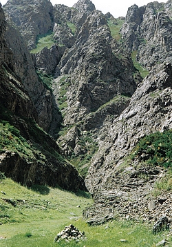 Gleich in der Nähe der Dünen stehen zwei Jurten von Nomadenfamilien, die hauptsächlich Kamele züchten. Hier gibt es auch Kamelmilch zur Probe, ein Getränk, was für mich keine Delikatesse werden wird. Am Abend bietet sich vom Touristencamp aus das Bild eines traumhaften Gobi Sonnenunterganges mit der Silhouette des Gurvan Saichan Gebirges. Genau in diese Landschaft fahren wir am nächsten Morgen. Das genaue Ziel ist die Geierschlucht im südlichen Teil des Gebirges. Der Weg dahin führt durch ein enges Tal auf einen Pass von dem man dann einen absolut beeindruckenden Blick in das Felsengebiet der Geierschlucht hat. Die Felswände sind bis zu 600 Meter hoch und Nistplatz von Geiern, Adlern und anderen Raubvögeln. Am Grund des Tals fließt ein glasklarer Bach und der Boden ist mit satt grünem Gras bewachsen. Ein Szenario, das völlig vergessen lässt, dass das Ganze mitten in der Wüste liegt. Die Schlucht verengt sich teilweise auf drei Meter Breite und hier wo nie ein Sonnenstrahl hingelangt erwärmt sich die Temperatur auch mittags kaum über 15 Grad. Normalerweise reicht die Kälte der Nacht aus, das hier ein Eisblock den Sommer überdauert. Heute kann man das aber nicht mehr in jedem Jahr beobachten. Bis in die siebziger Jahre soll es aber hier permanent Eis gegeben haben, das infolge einer Klimaerwärmung zurückgegangen ist.
