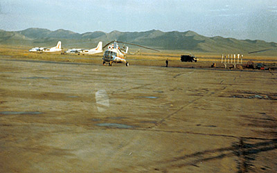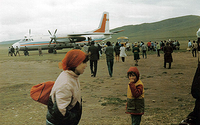 Nachdem ich bereits den Jahreswechsel ins Jahr 1986 in Ulaanbaatar verbracht habe, bin ich wild entschlossen im Sommer in die Mongolei zurück zu kehren und einen Ausflug in den Changai zu unternehmen. Bei der Anreise in die Mongolei kommt es zur ersten Überraschung, die Aeroflot-Maschine, die uns planmäßig nach Ulaanbaatar befördern sollte, beendet ihre Reise bereits nach der Zwischenlandung in Irkutsk. Nach einer guten Stunde erfahren wir, dass zu wenig Passagiere nach Ulaanbaatar an Bord sind und uns die mongolische MIAT mit einem wesentlich kleineren Propellerflugzeug abholen wird. Das kommt dann auch tatsächlich und bringt uns in die Mongolei. Da die Flughöhe kaum 4'000 Meter beträgt und die Sicht hervorragend ist bietet sich ein beeindruckendes Bild als wir in die Steppengebirge hineinfliegen, die bereits kurz vor der mongolischen Grenze ihren Anfang nehmen.