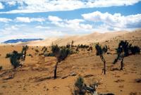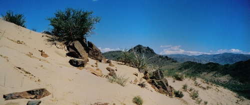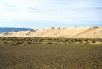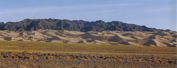 Ein landschaftliches Kontrastprogramm ist aber garantiert, auf einer Reise um den westlichen Changai, nachdem die Jurten der Viehzüchter auf satt grünen Wiesen so richtig den landläufigen Vorstellungen von Mongolei entsprechen könnten, liegt der abendliche Lagerplatz wieder inmitten von hohen Sanddünen die durch von Wüstenlack überzogene Felsspitzen durchbohrt werden, der Mongol Els ist erreicht, das größte und geheimnisvollste Sandgebiet der Mongolei. Zwischen diesen Sandbergen versickern die Flüsse des Changai oder sie magern zumindest ab, bis sie im Nord- Westen endgültig in einem der großen Salzseen ihren Lauf beenden.