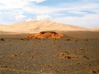 Von hier ab reduziert sich der Konvoi auf zwei Fahrzeuge, ein Minibus fährt vom Hungrijn Els die kleine Gobi Tour weiter und wird in vier Tagen schon wieder in der Hauptstadt sein, vor den anderen liegt erstmal eine hundertfünfzig Kilometer Etappe durch eine praktisch unbesiedelte Landschaft, die mit ihrer landschaftlichen Eigenart aber selbst in der Gobi ihresgleichen sucht. Berge in allen möglichen Gesteinsfarben, Wüstenpflanzen, die nur in der Gobi vorkommen, Sanddünen und mystische Trockenflüsse bestimmen das Bild von einer extrem unwirklich wirkenden Landschaft. Etwa auf halber Strecke zeichnet sich das feurige Abendrot am Horizont ab, es ist höchste Zeit das Camp für die Nacht einzurichten. Im Gegensatz zu manchen Steppenregionen ist es hier kein Problem Feuermaterial zu finden, die Wüste ist voller Sträucher, auch Saksaulbäume sind da, von denen natürlich nur abgestorbene Reste auf das Lagerfeuer wandern. Auch nach Einbruch der Dunkelheit will die Temperatur kaum sinken, aber der Kaminwind vom Vortag ist ebenfalls wieder da. Für ein größeres Campfeuer ist der zu stark und so liegen am nächsten Morgen noch Berge von Feuerholz am nächtlichen Lagerplatz, für die nächsten Gäste, aber das kann Monate dauern, denn für gewöhnlich rechnet man auf diesem Streckenabschnitt nicht in Fahrzeugen pro Tag, sondern in Tagen pro Fahrzeug, da kommt es selbst zu dieser Jahreszeit selten vor, dass sich Fahrzeuge begegnen.