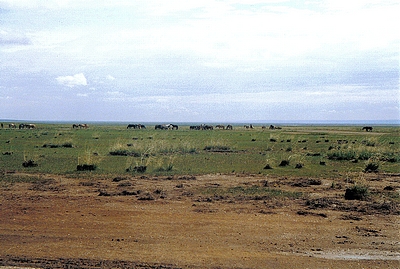 Hat es einmal eines der gewaltigen Gobi Gewitter gegeben geht hier tagelang gar nichts mehr, denn die Piste verläuft auf etwa zehn Kilometern durch einen Lößsumpf, der dann für kurze Zeit zum See wird und noch tagelang völlig unpassierbar bleibt, glücklicherweise ist jedoch Regen hier ein seltenes Ereignis. Wie sehr das Bild der Gobi von Regenfällen verändert werden kann zeigt sich in den nächsten Tagen, während die Schnittlauch-Ebenen der östlichen Gobi bis weit in den Süden satt grün erschienen, geradezu üppig grün, sieht die von Wüstensträuchern geprägte Übergangszone zu den Steppen des Changai braun, vegetationslos und nochmals braun aus. Ein Bild, wie es sich sonst eher umgekehrt darstellt. Regenfälle im Osten und Trockenheit im Westen haben die Landschaft, zumindest für einige Wochen, verwandelt, lediglich in den Flusstälern ist das Grün noch üppig.