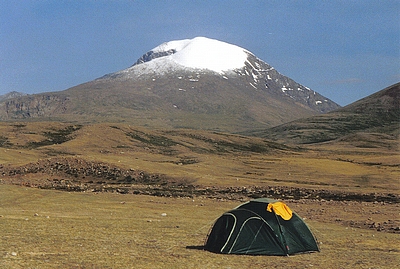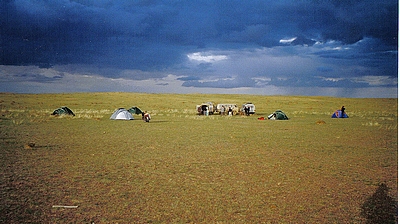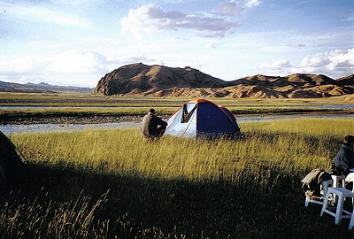 Hier am Otgon Tenger sind zwei Übernachtungen eingeplant, wohl wissend, dass es die kältesten Nächte der Tour werden, denn nach dem Sonnenuntergang sackt das Thermometer in zweieinhalbtausend Meter Höhe auf etwa null Grad und der Wind von der Eiskappe des Berges Berg tut sein Übriges. Das sind aber Unannehmlichkeiten, die man gern in Kauf nimmt, wenn am nächsten Morgen der Berg wolkenfrei in unmittelbarer Nachbarschaft liegt, fast greifbar, aber doch kaum erreichbar.