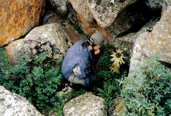 Als wir uns gerade daran machen, die Köstlichkeit aufzuteilen, verdunkelt sich im Westen der Himmel. Nach fünf Minuten sitzen wir unter Felsvorsprüngen in einem Schneegewitter. Binnen kurzem verschwinden die Blüten der wunderschönen alpinen Pflanzen unter einer weißen Decke. Als nach fast einer Stunde die Sonne wieder die Herrschaft übernommen hat, beginnt die Schneedecke sofort wieder zu tauen. Beim Abstieg werden wir noch zweimal vom Eisregen getroffen, bis wir das trockene Zelt erreichen.