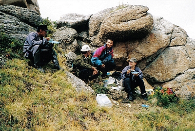 Wie Ziegen klettern die gut ausgewählten Pferde unablässig nach oben. Gut 200 Höhenmeter unter dem Gipfel ist aber Schluss. Von hier ab läuft nicht mal mehr ein mongolisches "Gebirgspferd". Was den uns begleitenden Araten gar nicht gefällt, denn ein Mongole vom Lande läuft eigentlich nie. Wir erreichen den Gipfel dennoch gemeinsam nach einer kurzen Kletterei und kochen uns beim schönsten Sonnenwetter eine Suppe.